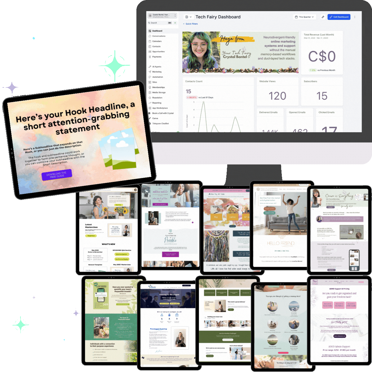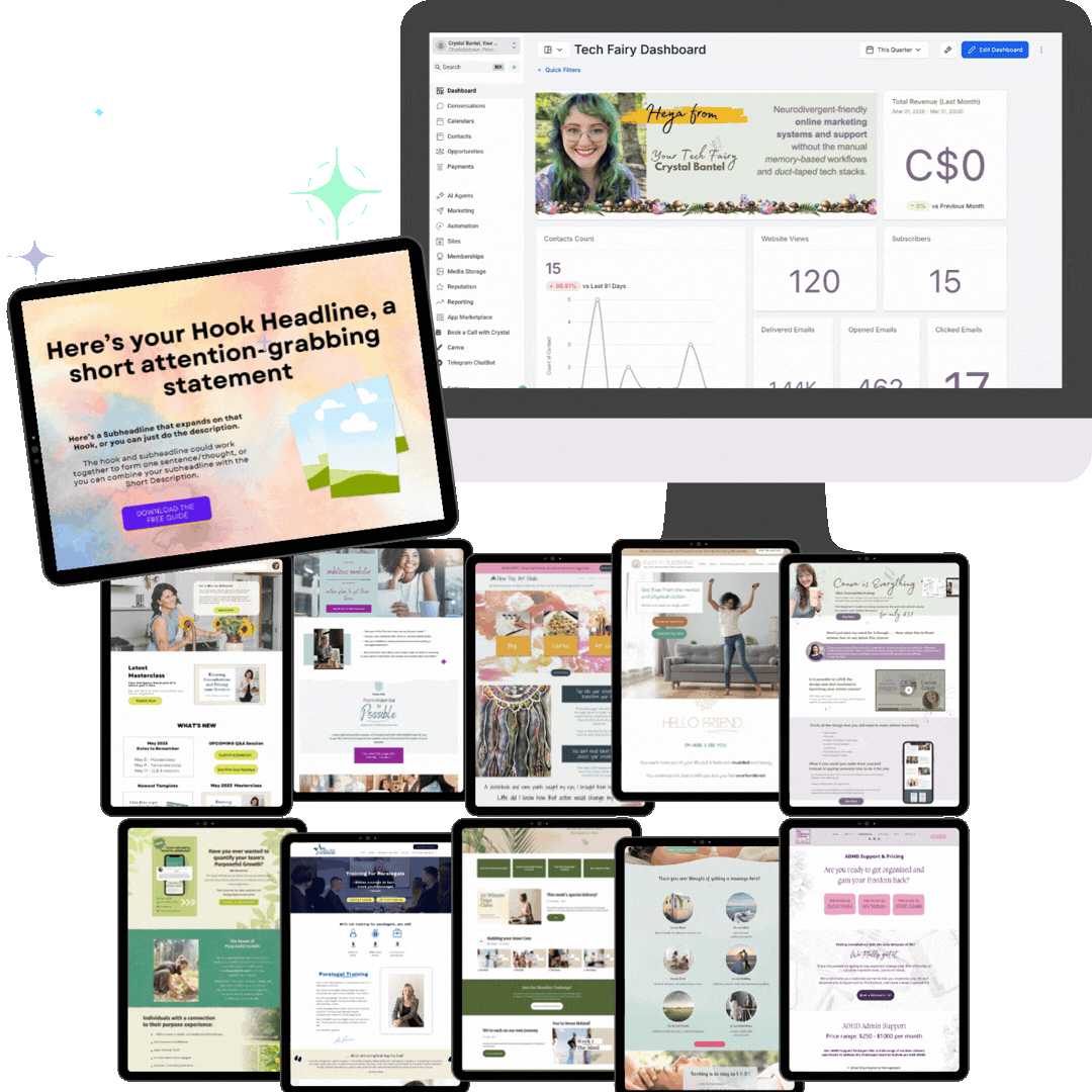 Tech Fairy Hub is where your website, funnels, emails, automations, and client experience finally live under one roof... built in a way that works with your brain.